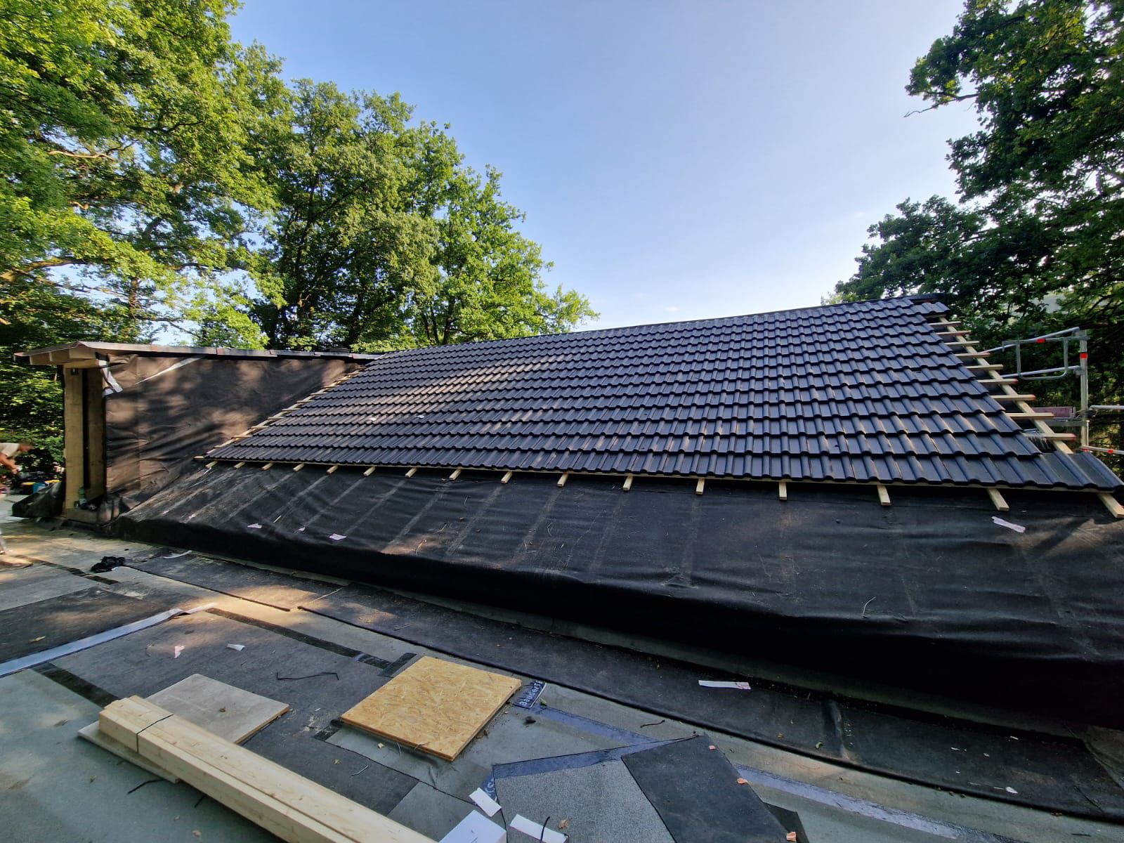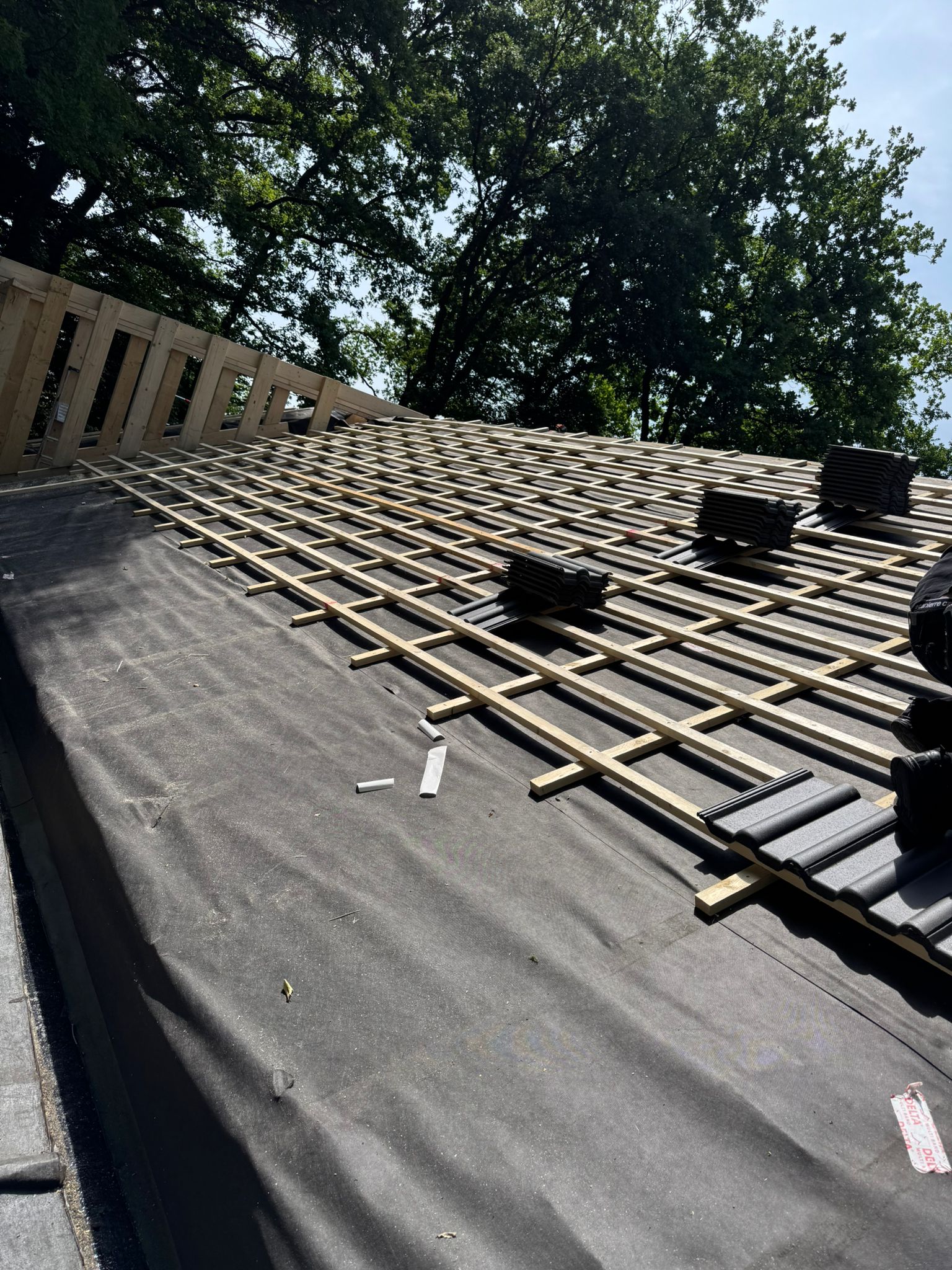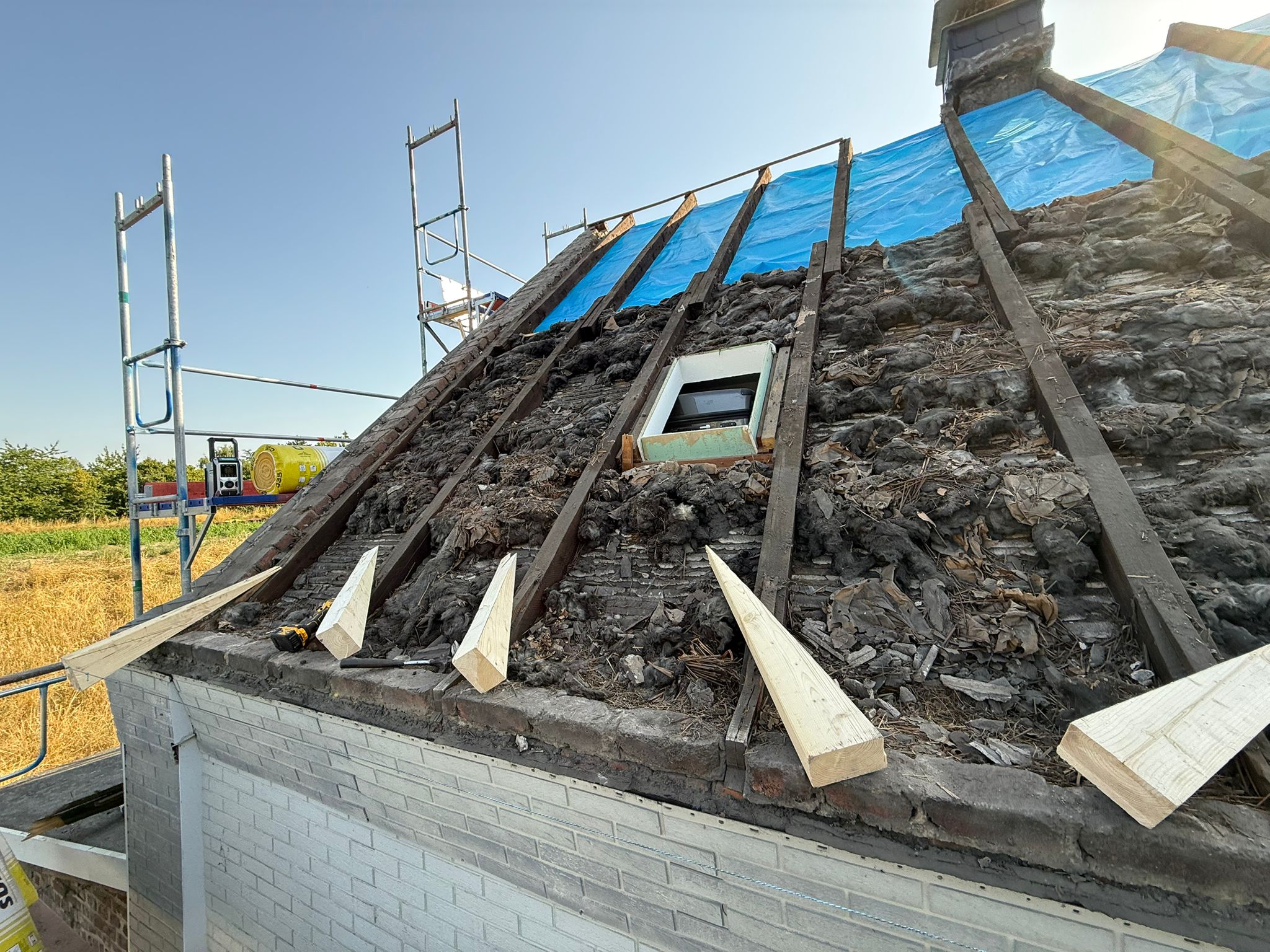 Im ersten Schritt wurde das alte Dach inklusive der ausgedienten Dämmung und maroden Lattung vollständig bis auf die Sparren rückgebaut. Anschließend haben wir das Gebäude energetisch auf den neuesten Stand gebracht: Eine neue, effiziente Wärmedämmung wurde eingebracht und mit einer hochdiffusionsoffenen Unterspannbahn fachgerecht und regensicher verschlossen. Dieser Aufbau schützt die Bausubstanz zuverlässig vor Feuchtigkeit und sorgt für ein hervorragendes Raumklima.