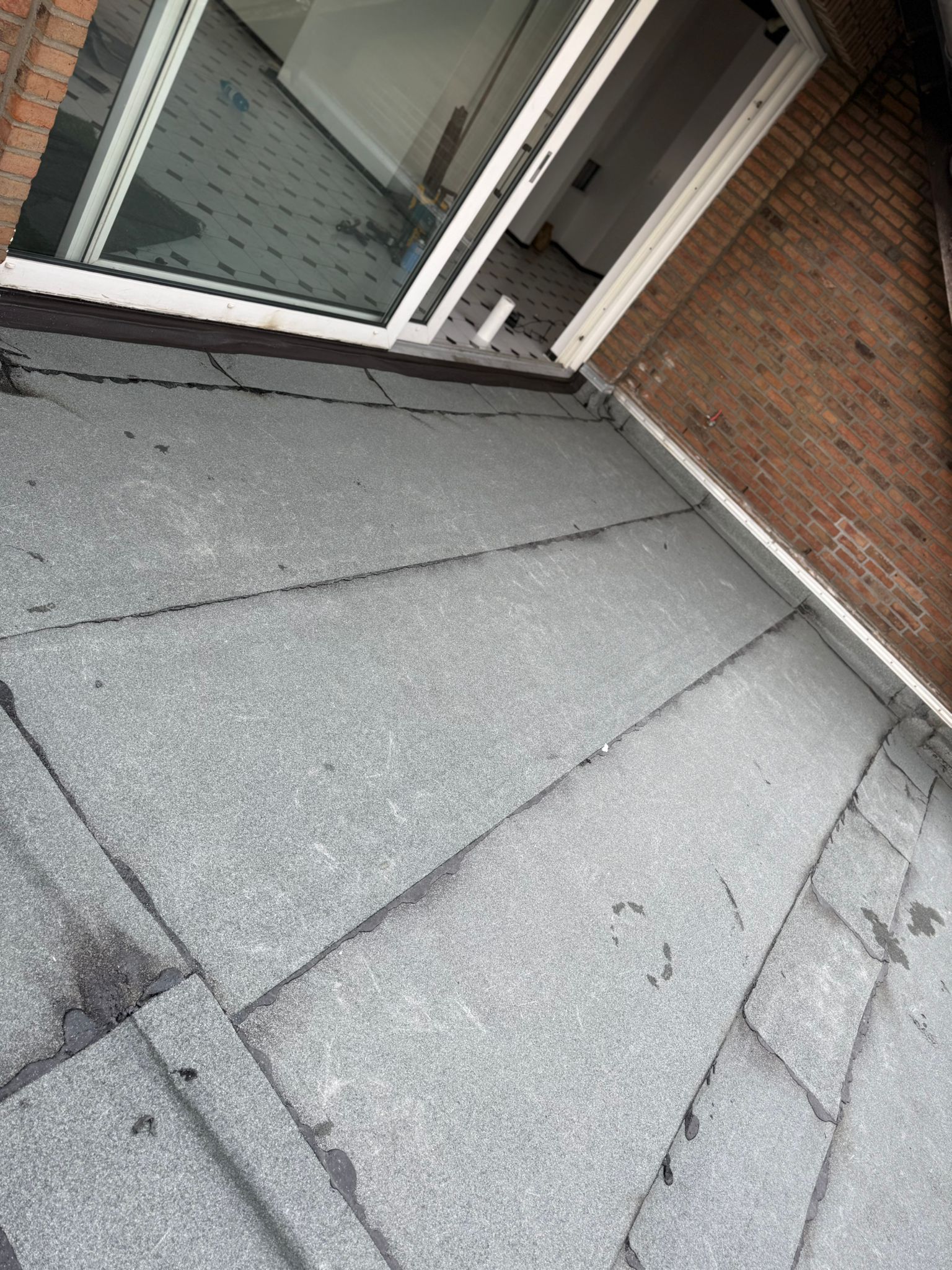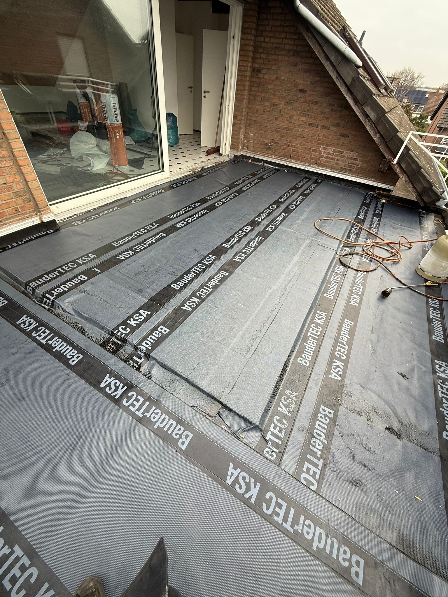Direkt auf der Dämmebene bauten unsere Fachkräfte ein hochwertiges, mehrlagiges Abdichtungssystem. Als erste Abdichtungsschicht kam eine spezielle kaltselbstklebende Elastomerbitumenbahn zum Einsatz, welche höchste Nahtsicherheit und perfekten Schutz bietet. Besondere handwerkliche Präzision erforderte die Detailausbildung an den bodentiefen Fenster- und Türanschlüssen sowie den Wandübergängen. Nur durch eine millimetergenaue Verlegung in diesen sensiblen Bereichen kann ein späterer Wassereintritt sicher ausgeschlossen werden. Den Abschluss bildet eine robuste, beschieferte Oberlagsbahn, die die Konstruktion dauerhaft vor UV-Strahlung, extremen Witterungseinflüssen und mechanischer Belastung schützt. Das Ergebnis ist eine sichere, langlebige Terrassenbasis in höchster handwerklicher Qualität.