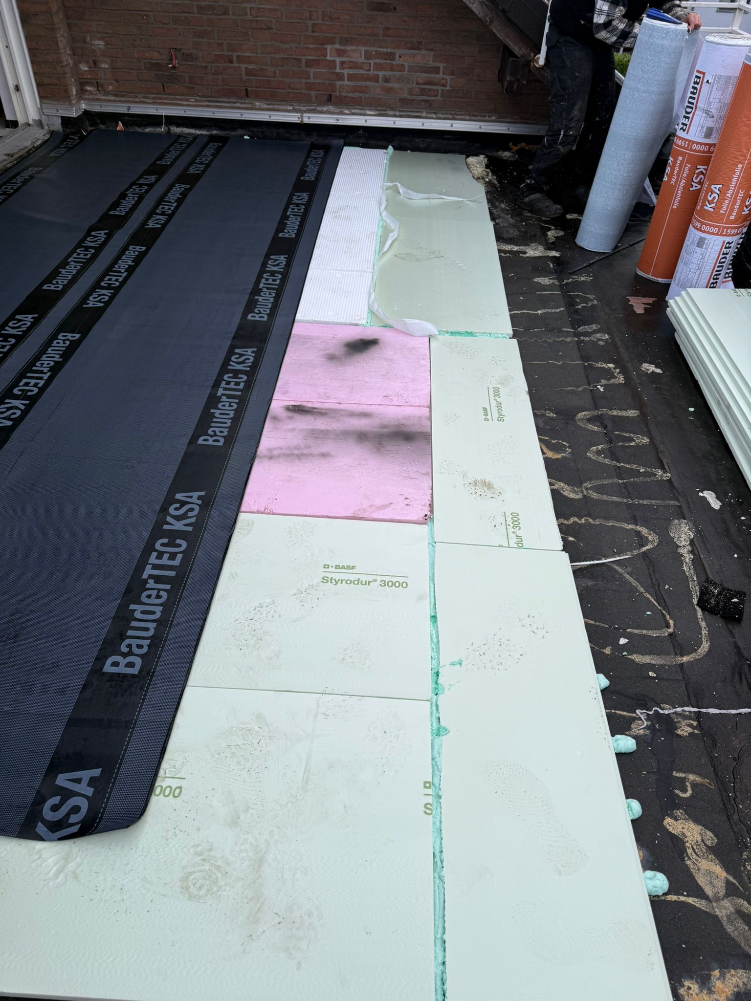 Die fotografische Dokumentation zeigt den systematischen und fachgerechten Aufbau der neuen Dachhaut. Im ersten Schritt wurde eine druckfeste und hochwirksame Wärmedämmung aus geschlossenzelligem Hartschaum (Styrodur) planeben und lückenlos verlegt. Diese Schicht ist essenziell, um den Wärmeverlust des Gebäudes zu minimieren und modernste energetische Standards zu erfüllen.